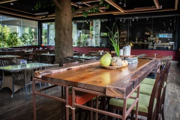 空間內座落一棵「光籽樹」搭配大面落地窗外綠樹,在自然的環境下,吃著天然食材的佳餚,使人身心舒暢。